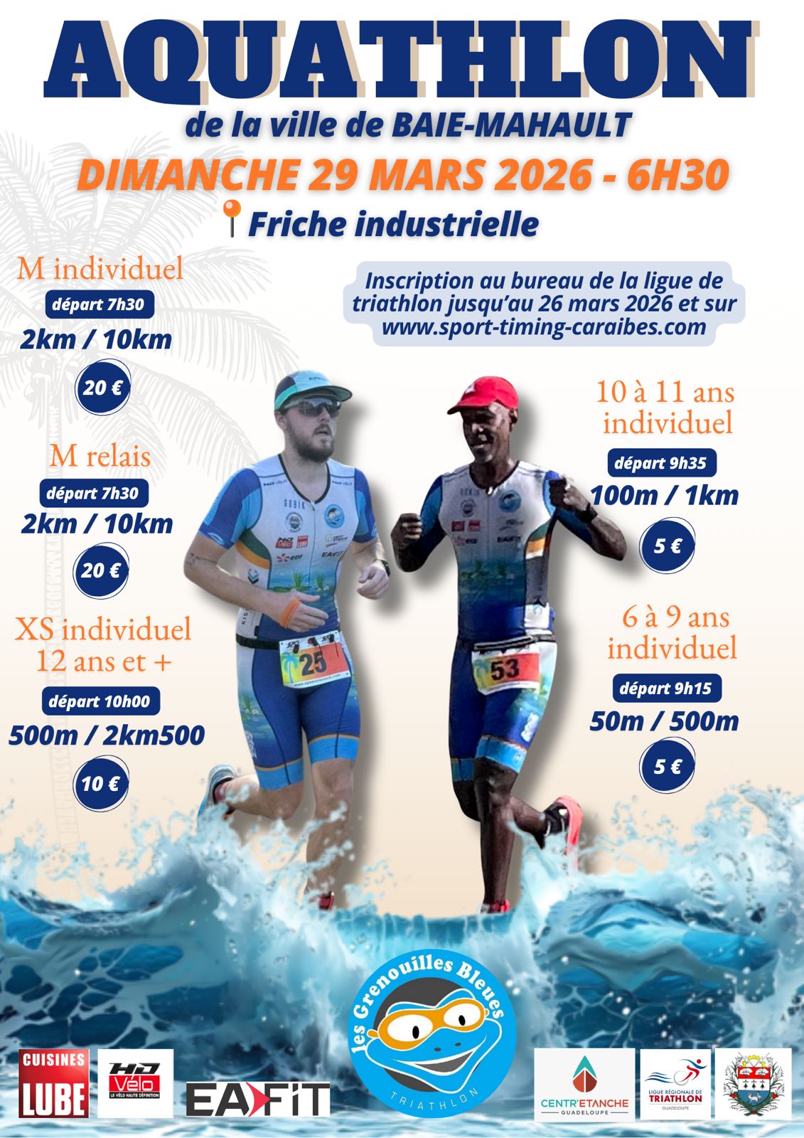 Résultats de l’aquathlon disponible sur www.sport-timing-caraibes.comLa grande gagnante est Clémence Briche du club des Tri Team Karaib avec le maximum de points possible sur nos